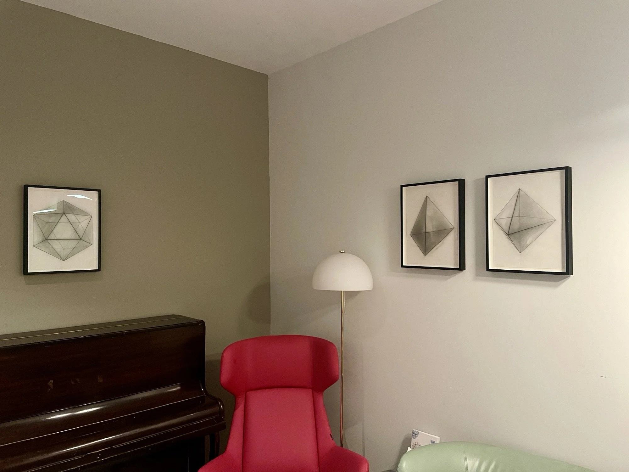 Octahedron, Icosahedron and Tetrahedron from Five Vague Platonic Solids series, Margarita Gluzberg - installed in the Staff Wellbeing Hub side room, Newham University Hospital