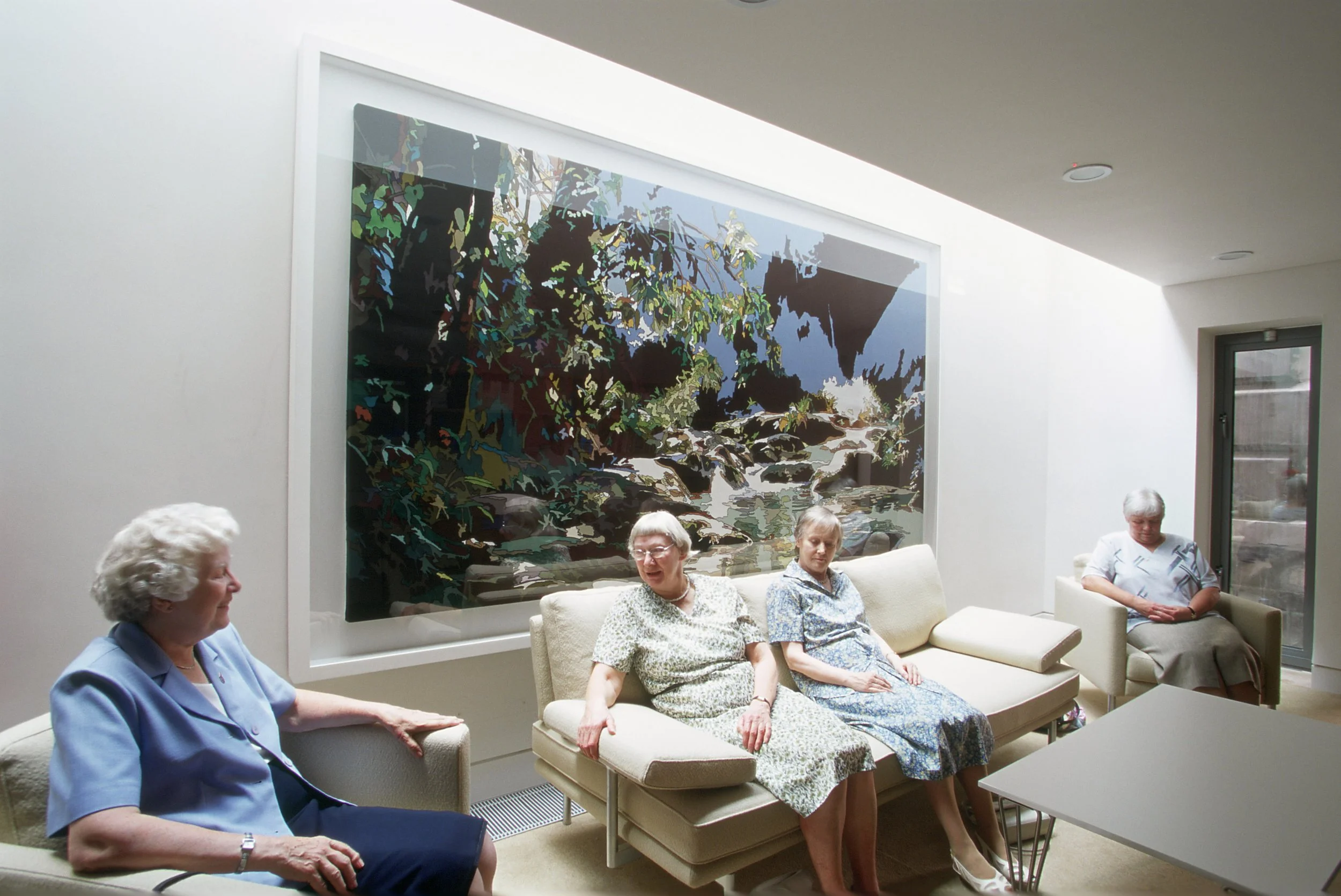 Dring uses a traditional form of needlework (fabric appliqué) to create illusionary utopias and Gardens of Eden in a never-ending quest for Arcadia. She draws inspiration from photographs she has taken as a tourist, or images borrowed from travel guides, picture postcards and calendars. At Barts, Dring invited hospital staff, patients and visitors to send her an image of their favourite landscape. She received hundreds of images, many of which showed tropical paradises, lakes or waterfalls. Dring decided to work with a photograph of a tropical paradise where light filters through the trees and plays across the water’s surface. As part of this commission, Dring also worked with staff, patients and members of the Breast Care Support Group in a series of open workshops, where people helped to cut out the hundreds of fabric shapes that have been stitched together to make the work.