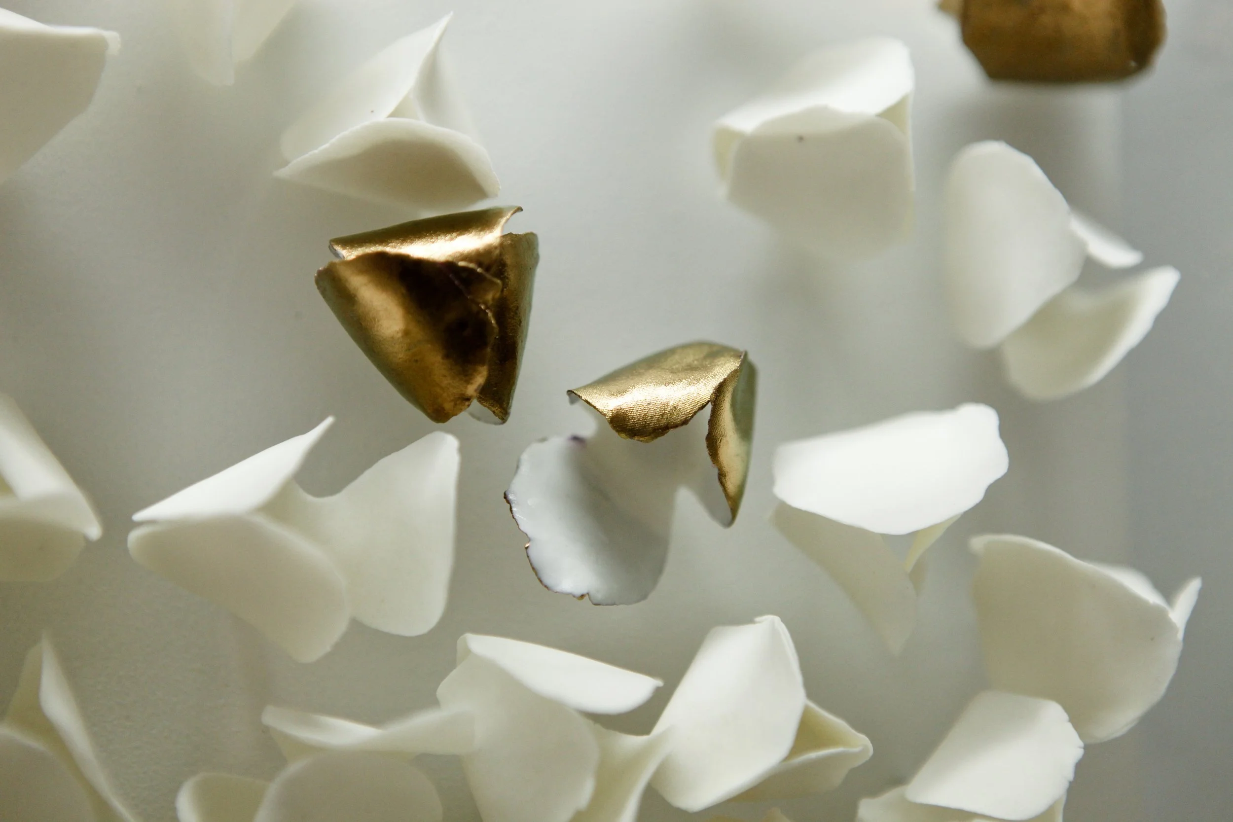Known for her restrained use of colour in elegant, graceful sculptures that seem to hover weightlessly, these artworks feature a cluster of paper-thin porcelain petals scattered across the surface, or neatly arranged in a tidy circle. Nascimento wishes to take the viewer on a journey through botanical and peaceful landscapes.